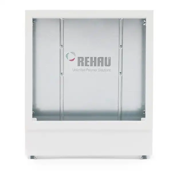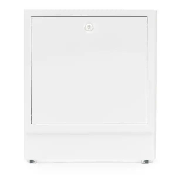 Razdelni ormarić za ugradnju u zid za montažu razdelnika i pratećeg pribora. Horizontalno i vertikalno podesivo pričvršćenje razdelnika, fabrički perforirani otvori za mogućnost obostranog priključenja razdelnika i uvođenje kablova u ormarić, skretna cev, završna maska za estrih i ram podesivi po dubini i demontažni, vratanca sa bravicom. U isporuci sadržani i formulari za hidraulički ispitni protokol i protokol o funkcijskom zagrevanju estriha, kao i oznake za grejne krugove. Oblik isporuke: ugradno kućište u kartonskoj zaštiti, ram i vratanca posebno zapakovani u foliju.