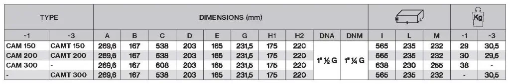 Maksimalni radni pritisak: 6 bar za CAM 100, 8 bar za veće modele
