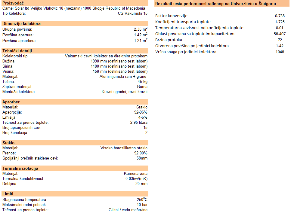 Kolektori se sastoje od 15 vakumiranih cevi sa visoko efikasnim selektivnim premazom. Staklena cev u unutrašnjosti ima PVD (fizicki depozit pare) selektivni premaz koji povećava apsorbciju cevi.
