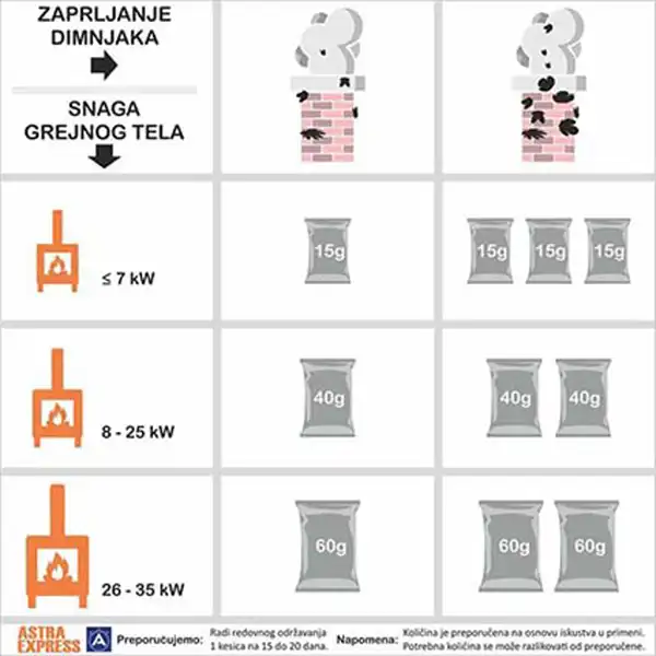 ASTRA EXPRESS je prah za katalitičko uklanjanje smole i gareži u dimnjaku i dimovodnim kanalima – sagoreva na 420 stepeni dok je uobičajena temperatura u ložištu preko 800 stepeni. Sagorevanjem praha nalepi smole postaju krti i trošni i lako se odlepljuju od zidova dimnjaka i dimovodnih kanala oslobađajući put dimnim gasovima.